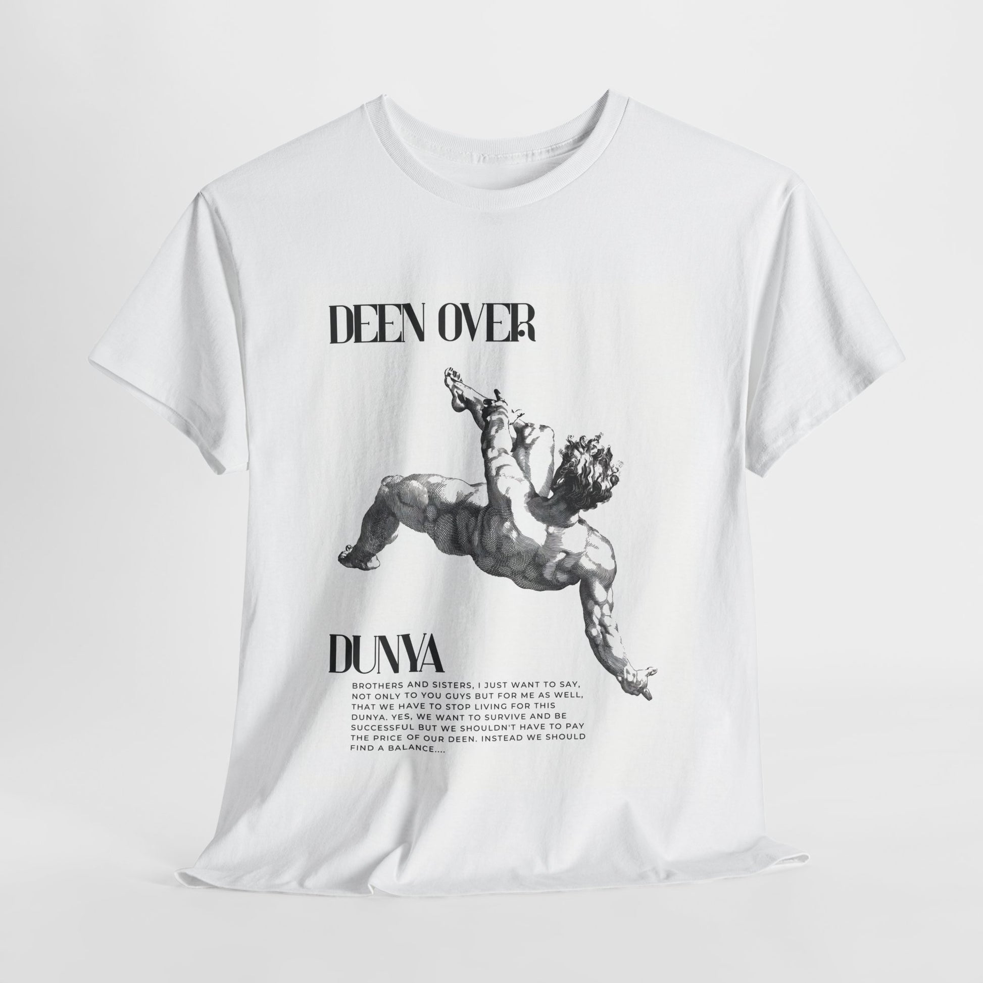 The "Deen Over Dunya" Dropout Angel Tee is for the ones who’ve fallen, fought, and found faith. Featuring a bold artistic graphic of a falling figure and a message rooted in spiritual awakening, this piece speaks louder than trends.